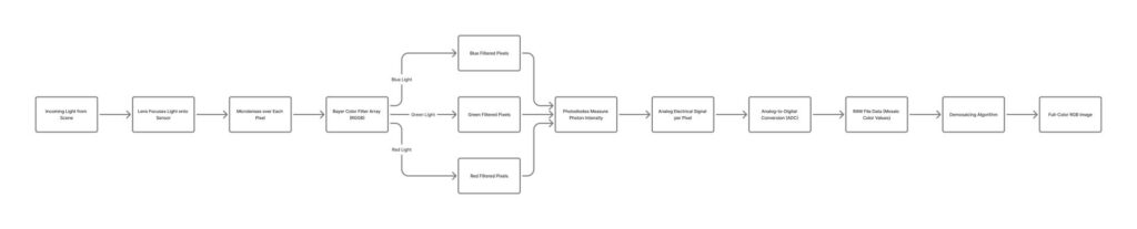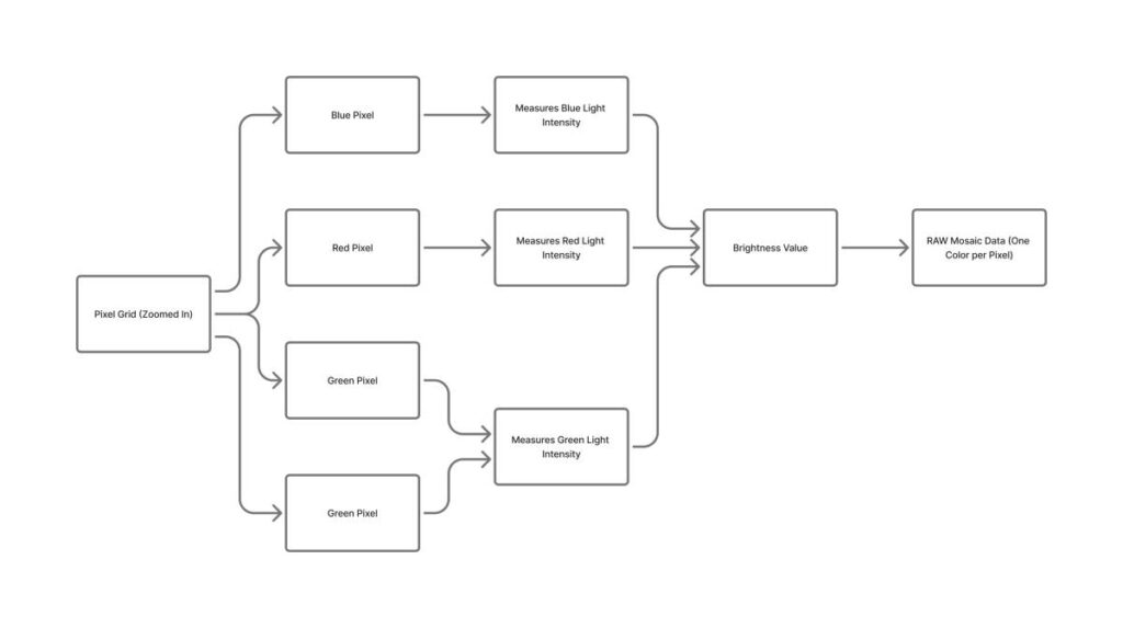 Digital cameras rely on sensors to measure light. Each sensor photosite records the intensity of light hitting it, filtered through a red, green, or blue filter.